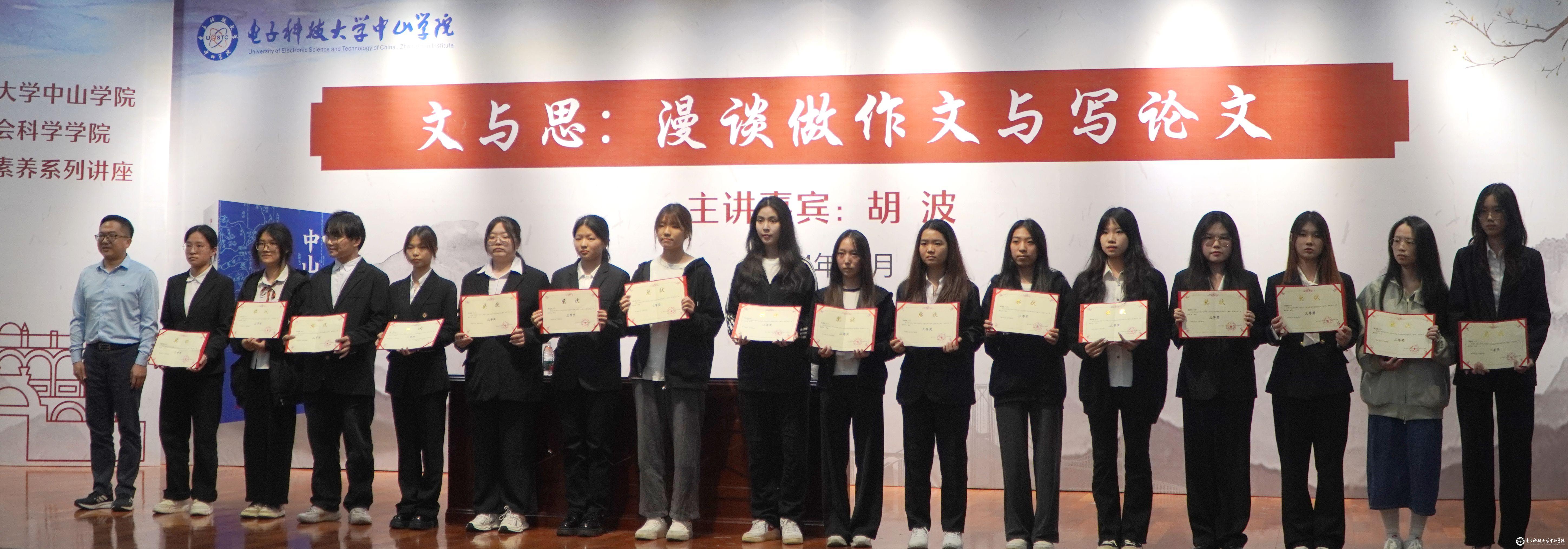 讲座结束后,举行了人文学院首届写作比赛的颁奖仪式。本次比赛人文学院共有2400余名学生参赛,经过学院的专业教师评委评审,共评选出一等奖7名、二等奖15名、三等奖36名,与会嘉宾为荣获一、二、三等奖的学生颁发荣誉证书。邓雪琳向获奖学生致以热烈祝贺,并勉励他们继续努力,精进写作技艺,在写作的道路上不断探索前行。